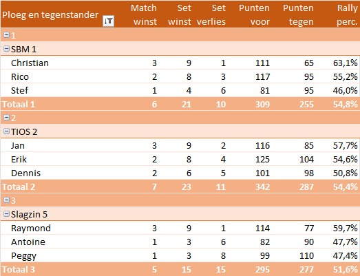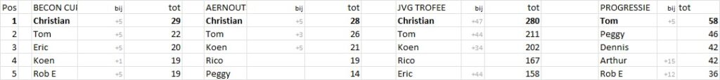 Op woensdag stonden er drie wedstrijden op het programma in de Tilburgse Liga. Het eerste team boekte een bescheiden overwinning op S.B.M. met 6-4. Na de comfortabele voorsprong in de eerste helft van het seizoen lijkt het team wat gas terug te hebben genomen. Team 2, bestaande uit Dennis, Jan en Erik, liet zich van zijn beste kant zien en versloeg TIOS overtuigend met 7-3. Poppel 3, inmiddels ook koploper, kon rekenen op een uitmuntende Raymond. Dankzij de belangrijke punten van Peggy en Antoine eindigde de wedstrijd in een gelijkspel: 5-5.