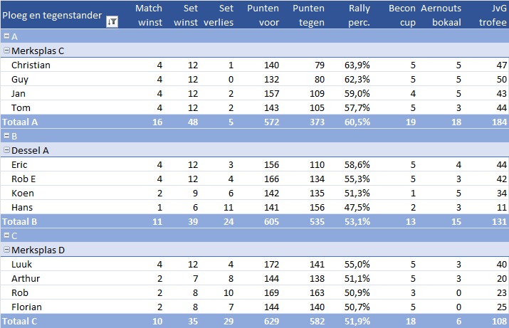 Vrijdag was het de beurt aan de tegenstanders in de Vlaamse Liga, met drie thuiswedstrijden op het programma. Poppel A liet geen spaan heel van Merksplas en won met maar liefst 16-0. Christian, Tom, Guy en Jan gaven slechts vijf sets prijs – een prestatie die geldt als de op één na grootste overwinning ooit. De B-ploeg, met onder andere Eric Schopman en met Koen, Rob Embrechts en Hans, kreeg meer tegenstand van het ervaren Dessel. Toch wisten ze de wedstrijd overtuigend met 11-5 te winnen, waarbij Eric en Rob ongeslagen bleven. Ook Poppel C nam het op tegen Merksplas en trok aan het langste eind met een 10-6 overwinning. In deze derby kwam het team geen moment in de problemen. Luuk Vermeer was ongenaakbaar met vier zeges, terwijl Rob Pijnenborg, Arthur en Florian elk twee wedstrijden op hun naam schreven. Zowel Poppel A als C voeren de ranglijst aan in de VTTL, en ook de B-ploeg klimt gestaag en staat inmiddels op plek vijf.